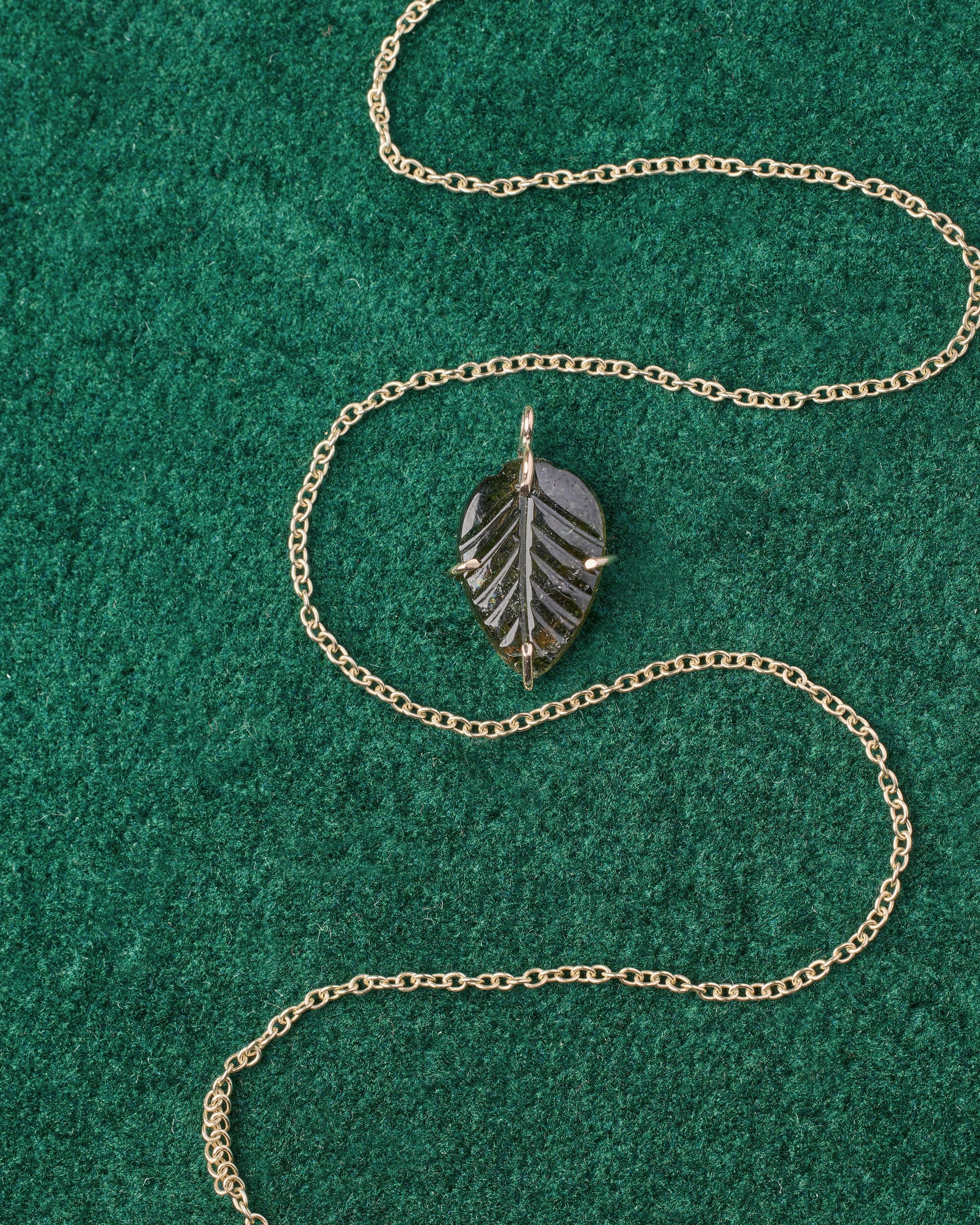 Delicate foglie di tormalina, ognuna diversa dall’altra per sfumature e forma, vengono abbracciate da quattro sottili fili in oro giallo 9 kt.